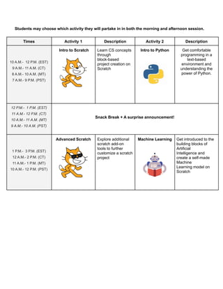 The document outlines a schedule for students, allowing them to choose from various activities in both morning and afternoon sessions. Activities include programming concepts through Scratch and Python, with breaks for snacks and announcements. Afternoon sessions feature advanced Scratch tools and an introduction to machine learning.