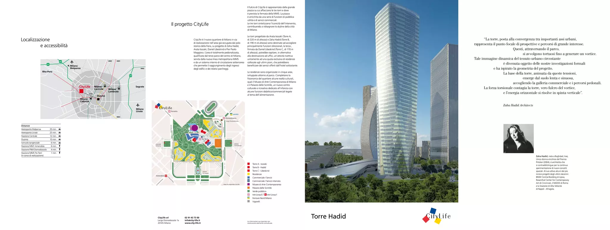 CityLife è un nuovo quartiere di Milano che include una grande piazza attorno a tre torri iconiche progettate da Arata Isozaki, Zaha Hadid e Daniel Libeskind. Il progetto mira a ridisegnare lo skyline di Milano e integra spazi residenziali, commerciali e culturali, oltre a un'importante fermata della metropolitana. Le torri sono progettate per essere sostenibili e funzionali, con attenzione all'efficienza energetica e al comfort degli spazi interni.