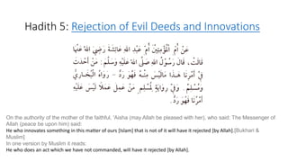 This hadith emphasizes that any religious actions or innovations that are not supported by the Quran and authentic Sunnah will be rejected. While intentions are important, actions must also be carried out according to Islamic guidelines. Worship acts require explicit evidence from sacred sources, while general matters like dress and food are permissible unless explicitly prohibited. There is debate around the concept of "good innovations", with some scholars like Ash-Shafi'i arguing innovations can be acceptable if consistent with Islamic principles and not meant to exaggerate worship.