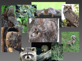 Gray squirrels live in wooded areas with dense vegetation that provide food and shelter. They depend on trees for food like nuts, acorns, and bark. Squirrels will also live near humans in parks and backyards if there are trees. Squirrels begin reproducing at one year old, giving birth to litters of 2-3 blind, hairless pups twice a year. They live on average 6 years in wooded areas but less in urban areas with threats like cars. Overpopulation affects all animals by reducing available food.