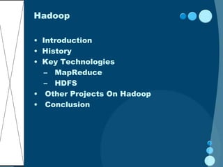 Hadoop is an open-source framework for distributed storage and processing of large datasets across clusters of commodity hardware. It was created to support applications handling large datasets operating on many servers. Key Hadoop technologies include MapReduce for distributed computing, and HDFS for distributed file storage inspired by Google File System. Other related Apache projects extend Hadoop capabilities, like Pig for data flows, Hive for data warehousing, and HBase for NoSQL-like big data. Hadoop provides an effective solution for companies dealing with petabytes of data through distributed and parallel processing.