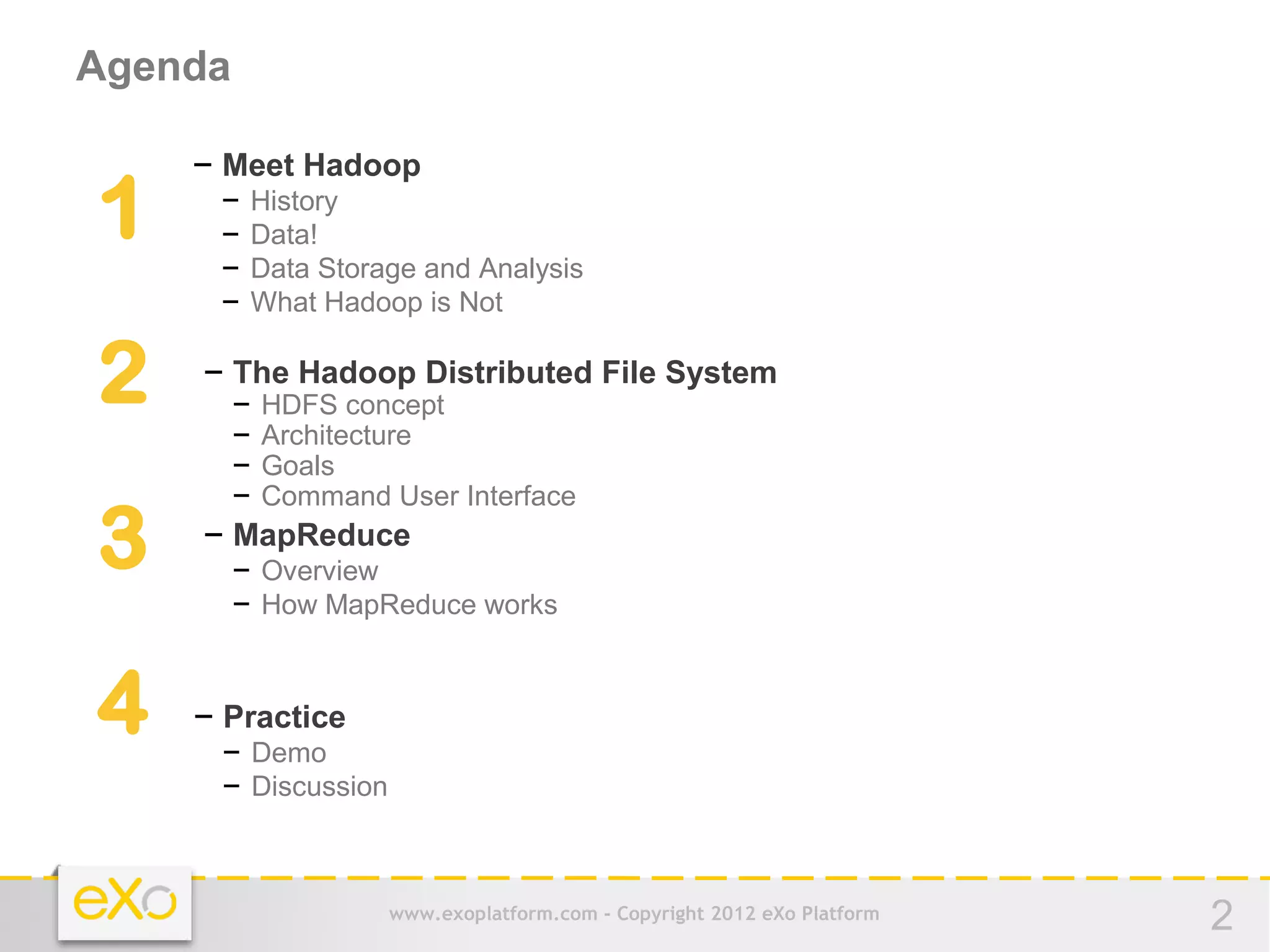 This document provides an agenda for a presentation on Hadoop. It begins with an introduction to Hadoop and its history. It then discusses data storage and analysis using Hadoop and what Hadoop is not suitable for. The remainder of the document outlines the Hadoop Distributed File System (HDFS), MapReduce framework, and concludes with a practice section involving a demo and discussion.