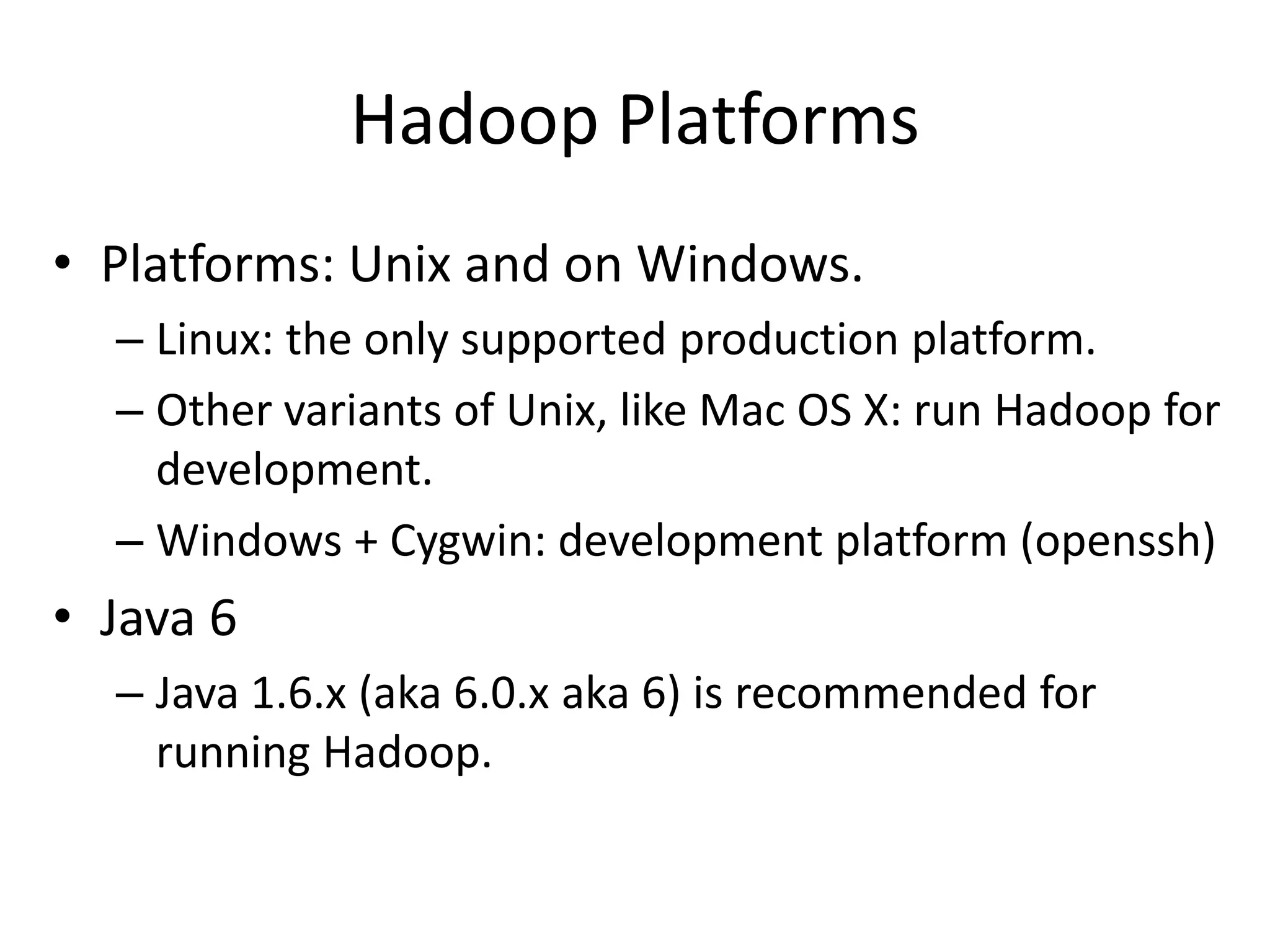 The document provides instructions for running Hadoop in standalone, pseudo-distributed, and fully distributed modes. It discusses downloading and installing Hadoop, configuring environment variables and files for pseudo-distributed mode, starting Hadoop daemons, and running a sample word count MapReduce job locally to test the installation.