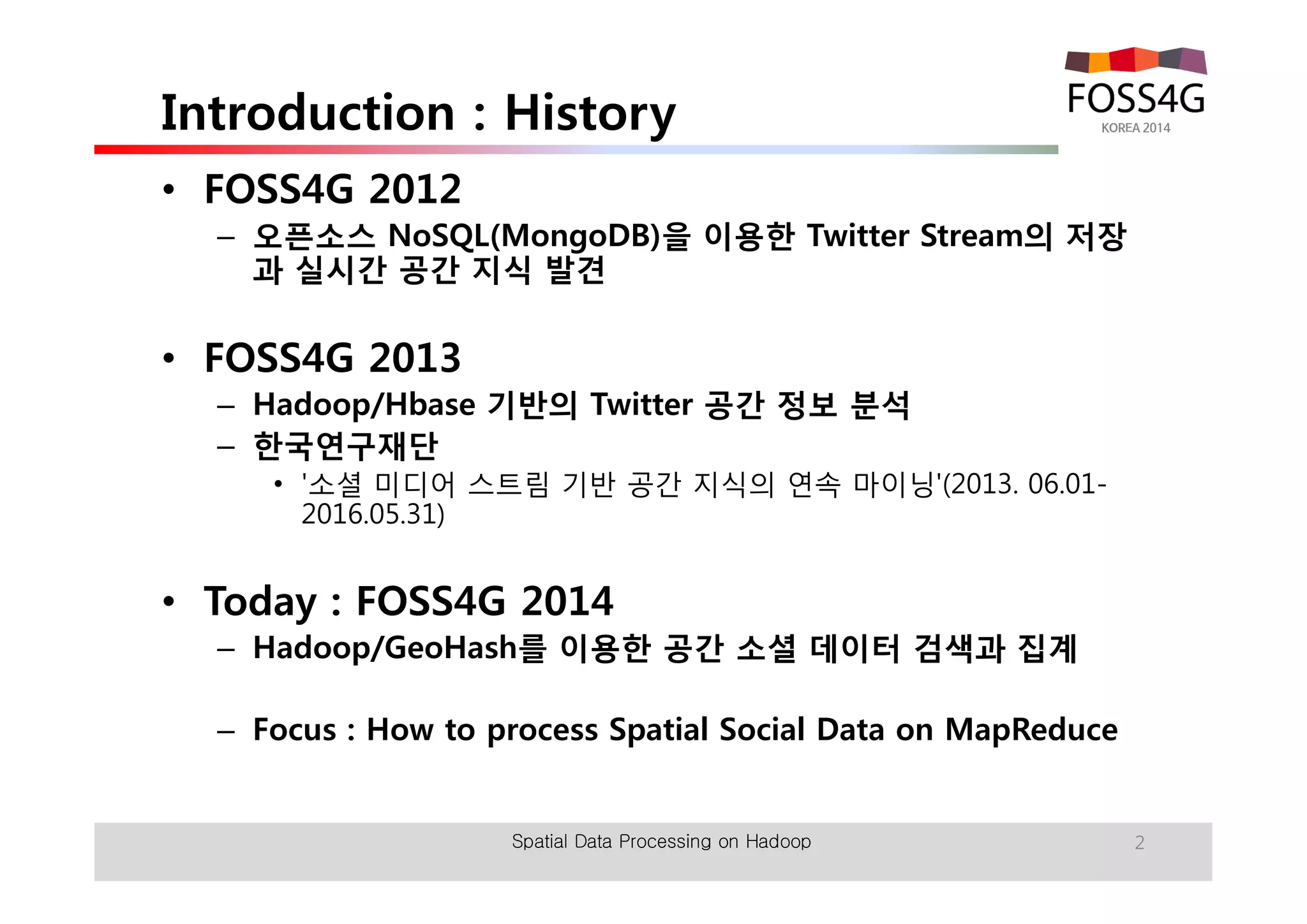 The document outlines methods for processing spatial big data using Hadoop and MapReduce, focusing on social media data, particularly Twitter streams. It describes the architecture of a Hadoop cluster, the use of geohashing for spatial keys, and spatial aggregation techniques for analyzing large datasets. The document also highlights the construction and management of big data systems, with practical insights and tools from ESRI for optimizing geospatial data processing.
