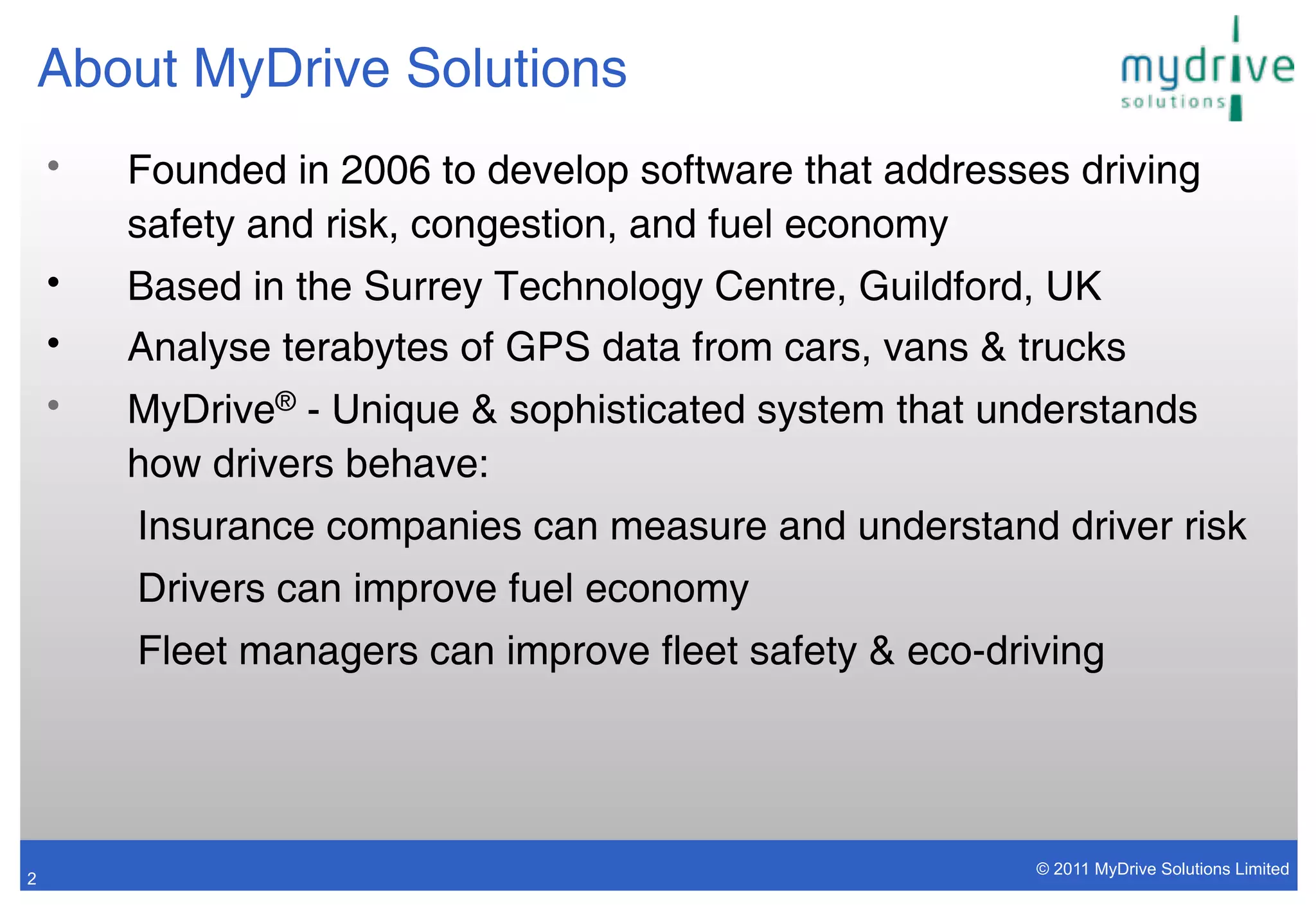 The document discusses the use of Apache Hadoop for managing and analyzing big data, particularly in the context of MyDrive Solutions, which focuses on improving driving safety and fuel economy using GPS data. It highlights the challenges associated with large data volumes and the capabilities of Hadoop, including its distributed computing platform and the MapReduce programming model. The document also outlines various tools within the Hadoop ecosystem, such as Pig and Hive, for data analysis and processing.