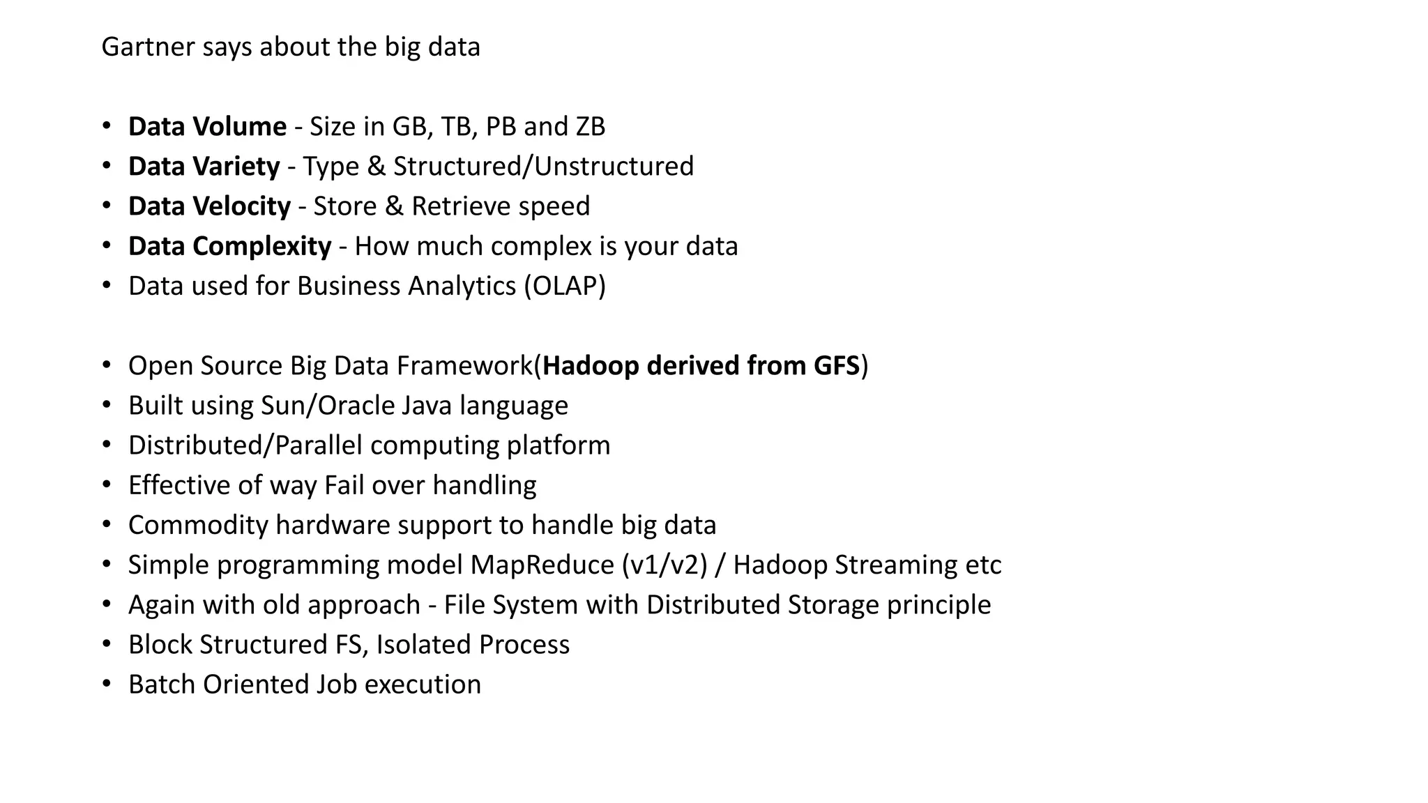 Hadoop is an open-source framework that processes large datasets in a distributed manner across commodity hardware. It uses a distributed file system (HDFS) and MapReduce programming model to store and process data. Hadoop is highly scalable, fault-tolerant, and reliable. It can handle data volumes and variety including structured, semi-structured and unstructured data.