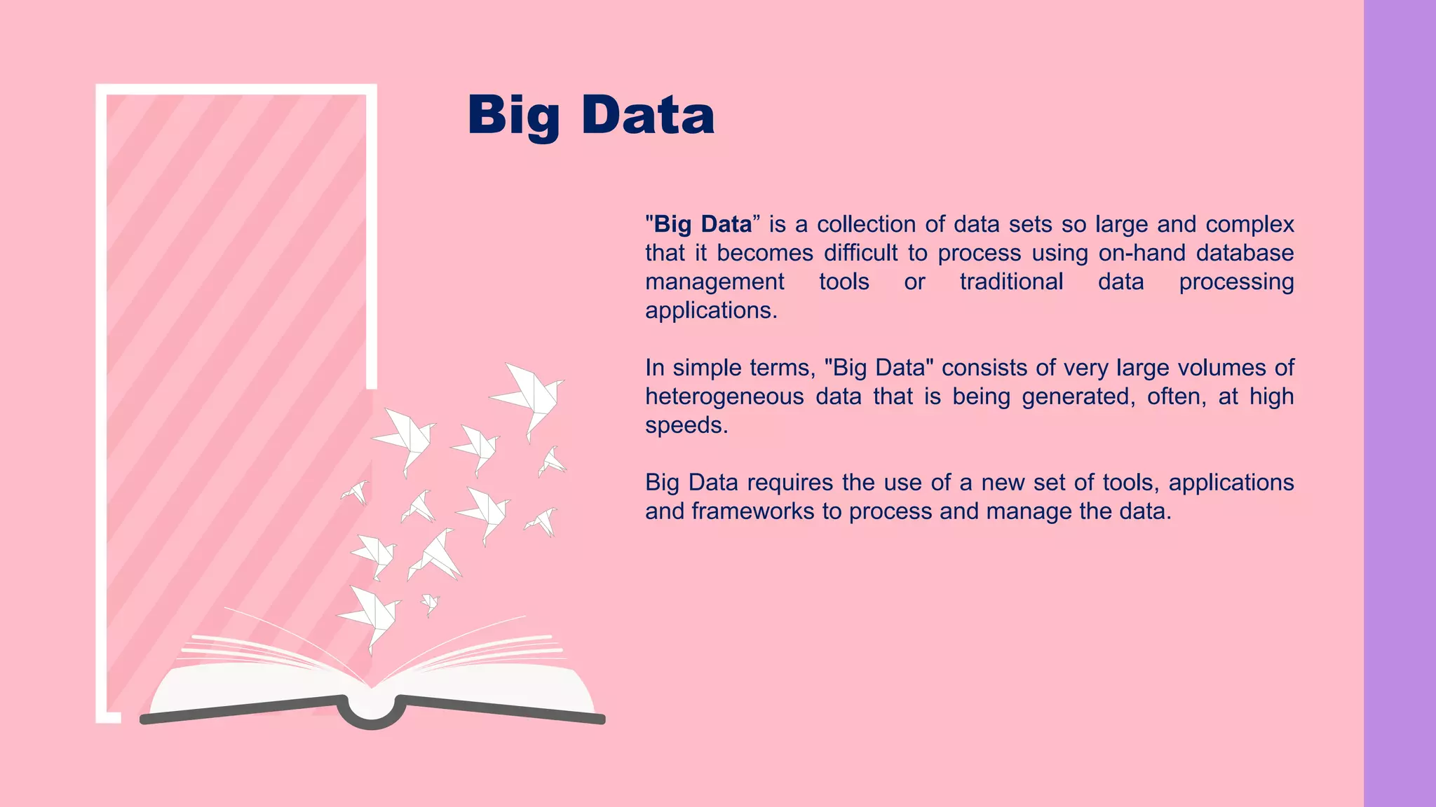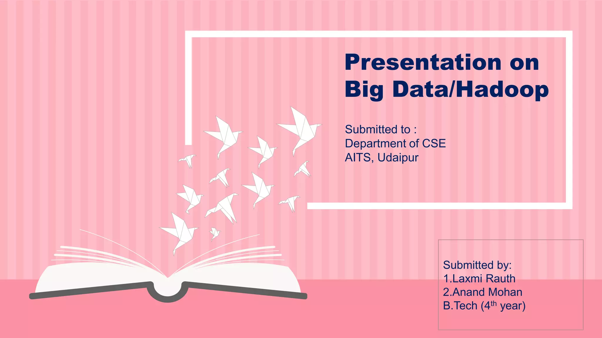 The document is a presentation on big data and Hadoop, highlighting the challenges of processing vast data sets and introducing Hadoop as an open-source framework for distributed data processing. It outlines the characteristics of big data, including volume, velocity, and variety, and details Hadoop's components like HDFS for storage and MapReduce for data analysis. The document also covers installation instructions, various Hadoop distributions, and key ecosystem tools within the Hadoop framework.