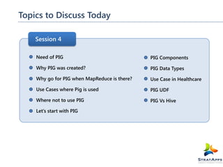 Pig is a platform for analyzing large datasets that sits on top of Hadoop. It provides a simple language called Pig Latin for expressing data analysis processes. Pig Latin scripts are compiled into series of MapReduce jobs that process and analyze data in parallel across a Hadoop cluster. Pig aims to be easier to use than raw MapReduce programs by providing high-level operations like JOIN, FILTER, GROUP, and allowing analysis to be expressed without writing Java code. Common use cases for Pig include log and web data analysis, ETL processes, and quick prototyping of algorithms for large-scale data.