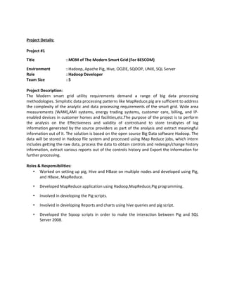 Mallikarjun Kori is a software professional with over 3 years of experience in technologies like SQL, Java, Hadoop. He has expertise in big data ecosystems such as HDFS, HBase, Hive, Pig, Sqoop, Oozie, Flume, and MapReduce. He has worked on projects involving processing large datasets using Hadoop for companies in utilities and banking domains. His responsibilities included developing Pig and Hive scripts, Sqoop scripts, MapReduce applications, and reports. He holds an MCA degree from KSOU Mysore and a BCA from Gulbarga University.
