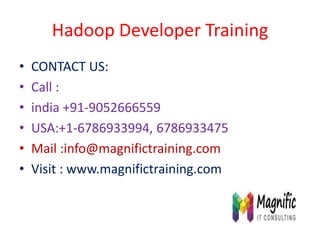 This document outlines the topics covered in a Hadoop developer training course, including introductions to big data and Hadoop, the Hadoop ecosystem, MapReduce concepts, Pig, Hive, Oozie, HBase, use cases, and developing MapReduce applications. Contact information is also provided for the training organization. Real-life use cases and concepts like HDFS, clusters, racks, and algorithms will be discussed alongside hands-on exercises like writing and reading from HDFS and solving problems using MapReduce flows and programming.