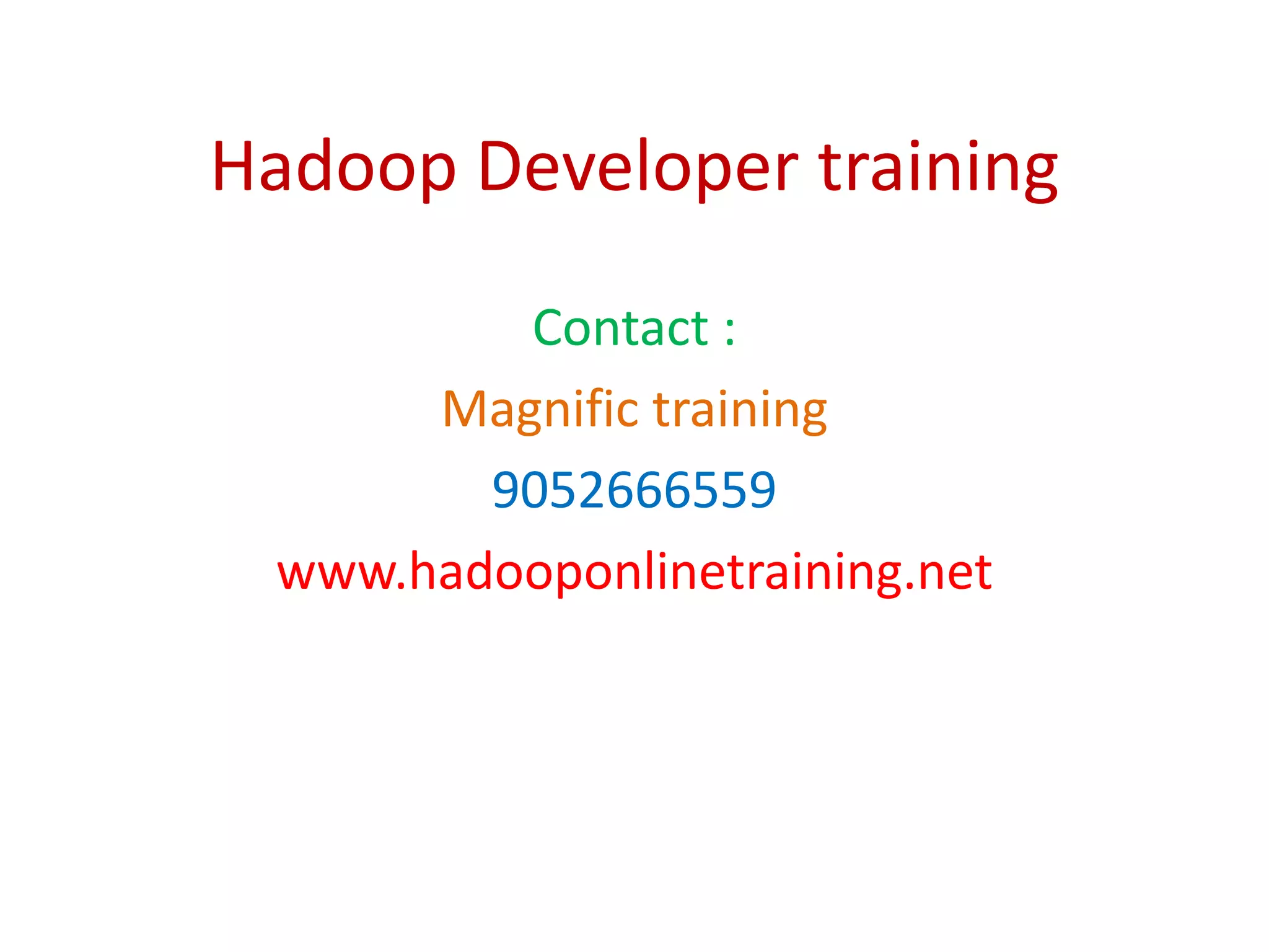 This document provides information about a 4-day Hadoop Developer training course offered by Magnific training. The course teaches students how to write MapReduce programs, test them, use the Hadoop API, and optimize jobs. It is intended for developers with programming experience who want to build data processing applications using Apache Hadoop.
