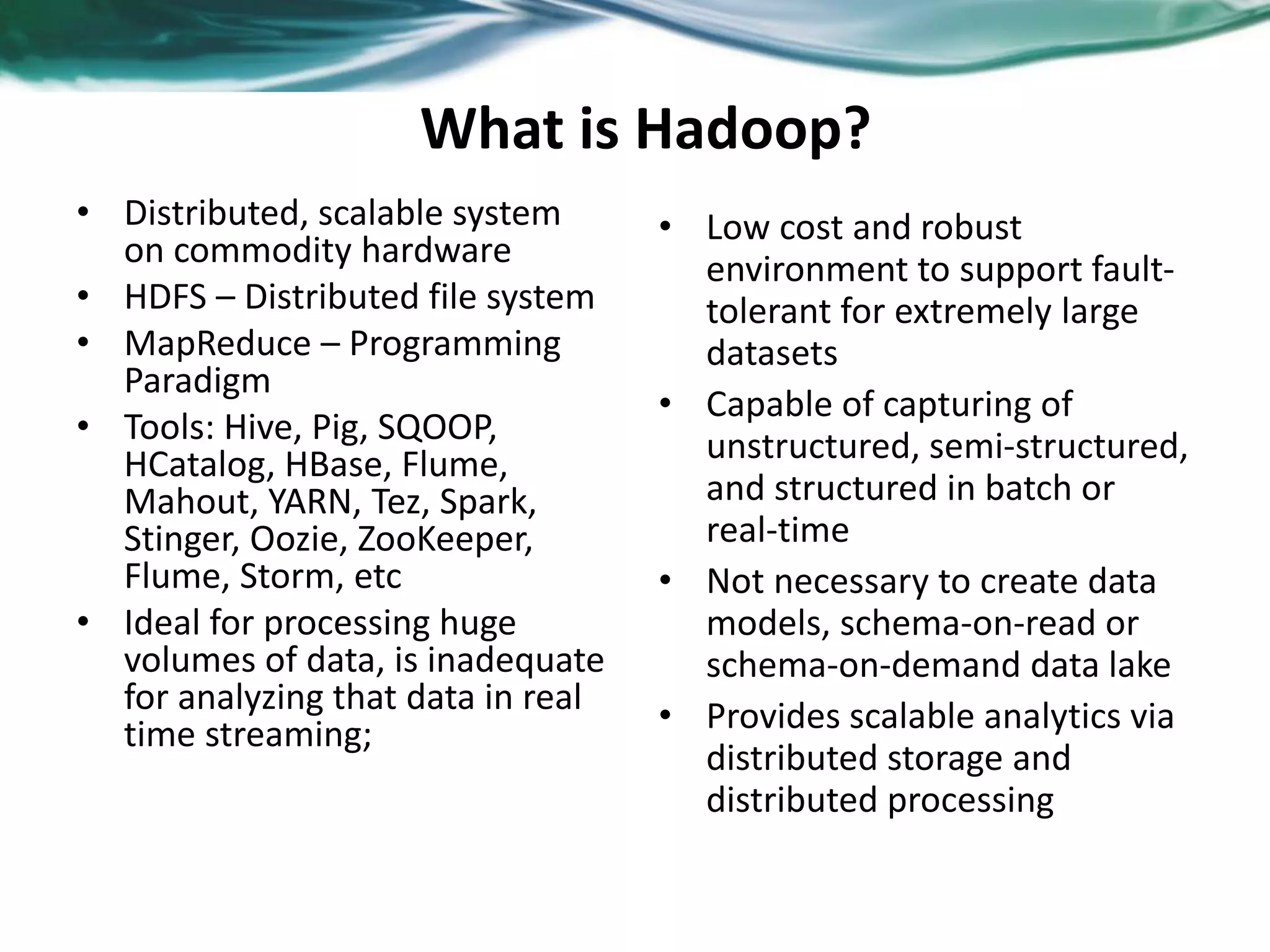 Hadoop is a distributed processing framework for large datasets. It utilizes HDFS for storage and MapReduce as its programming model. The Hadoop ecosystem has expanded to include many other tools. YARN was developed to address limitations in the original Hadoop architecture. It provides a common platform for various data processing engines like MapReduce, Spark, and Storm. YARN improves scalability, utilization, and supports multiple workloads by decoupling cluster resource management from application logic. It allows different applications to leverage shared Hadoop cluster resources.