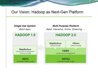Hadoop is a distributed processing framework for large datasets. It utilizes HDFS for storage and MapReduce as its programming paradigm. The Hadoop ecosystem has expanded to include many other tools. YARN was developed to address limitations in the original Hadoop architecture. It provides a framework for multiple data processing engines and improves cluster utilization, scalability, and agility. YARN introduces a generalized resource management model and separates generic services from application logic. This allows different applications like batch, interactive, and streaming to run concurrently on the same Hadoop cluster.
