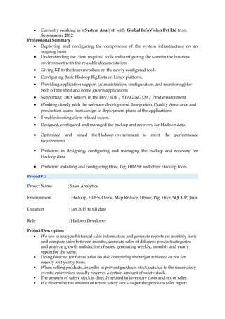 M.V. Rama Kumar has 3 years of experience in application development using Java and big data technologies like Hadoop. He has 1.6 years of experience using Hadoop components such as HDFS, MapReduce, Pig, Hive, Sqoop, HBase and Oozie. He has extensive experience setting up Hadoop clusters and processing large, structured and unstructured data.
