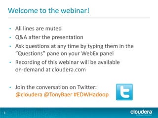 2. Cloudera provides tools like Impala and Cloudera Manager to integrate Hadoop with SQL data platforms and better support Hadoop deployments. This allows Hadoop to be more easily used as a data transformation platform and extension to existing data warehouses.