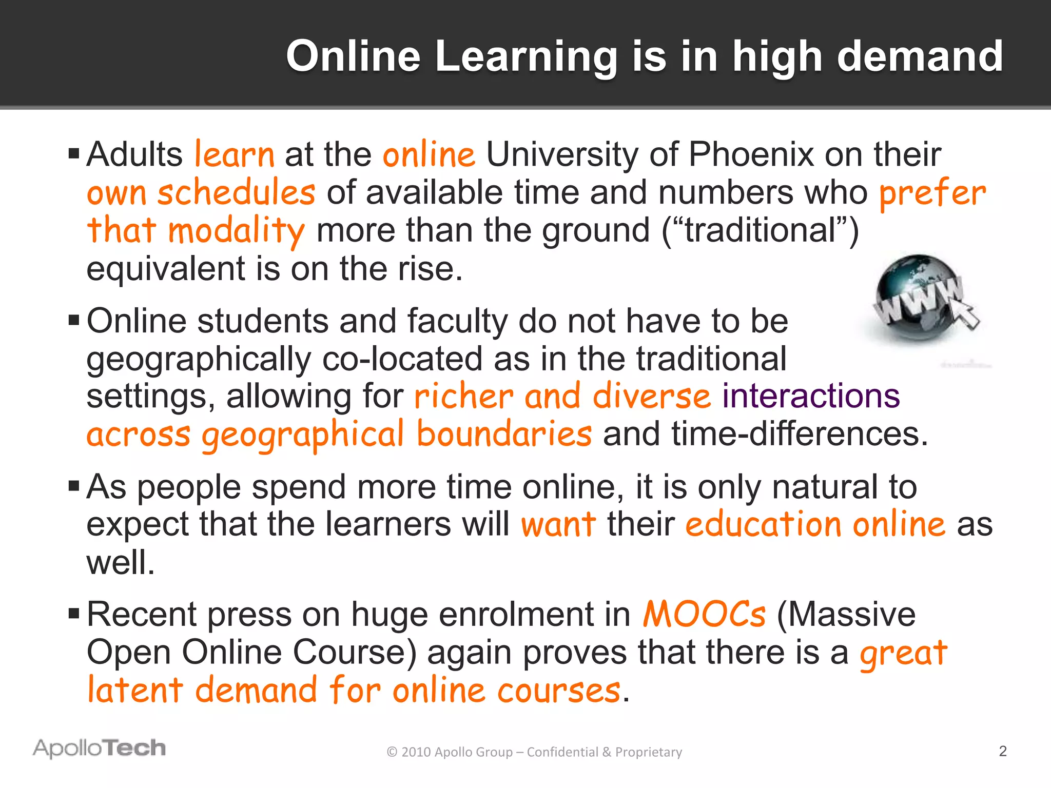 The document discusses using data and analytics in online education. It notes that online learning is increasingly popular as people can learn on their own schedule and from anywhere. However, online education faces challenges in keeping each unique learner engaged. The document proposes addressing this by collecting detailed interaction data and using algorithms to provide personalized recommendations and guidance to students and teachers. It outlines an architecture that would log student and faculty data, process the logs in Hadoop, and power data-driven applications to improve instruction and learning outcomes. Examples discussed include faculty dashboards providing insights and an adaptive math tutor enhancing activities based on student performance data.