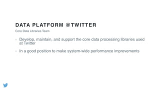 - Profiling Hadoop jobs at Twitter revealed that compression/decompression of intermediate data and deserialization of complex object keys were very expensive. Optimizing these led to performance improvements of 1.5x or more.