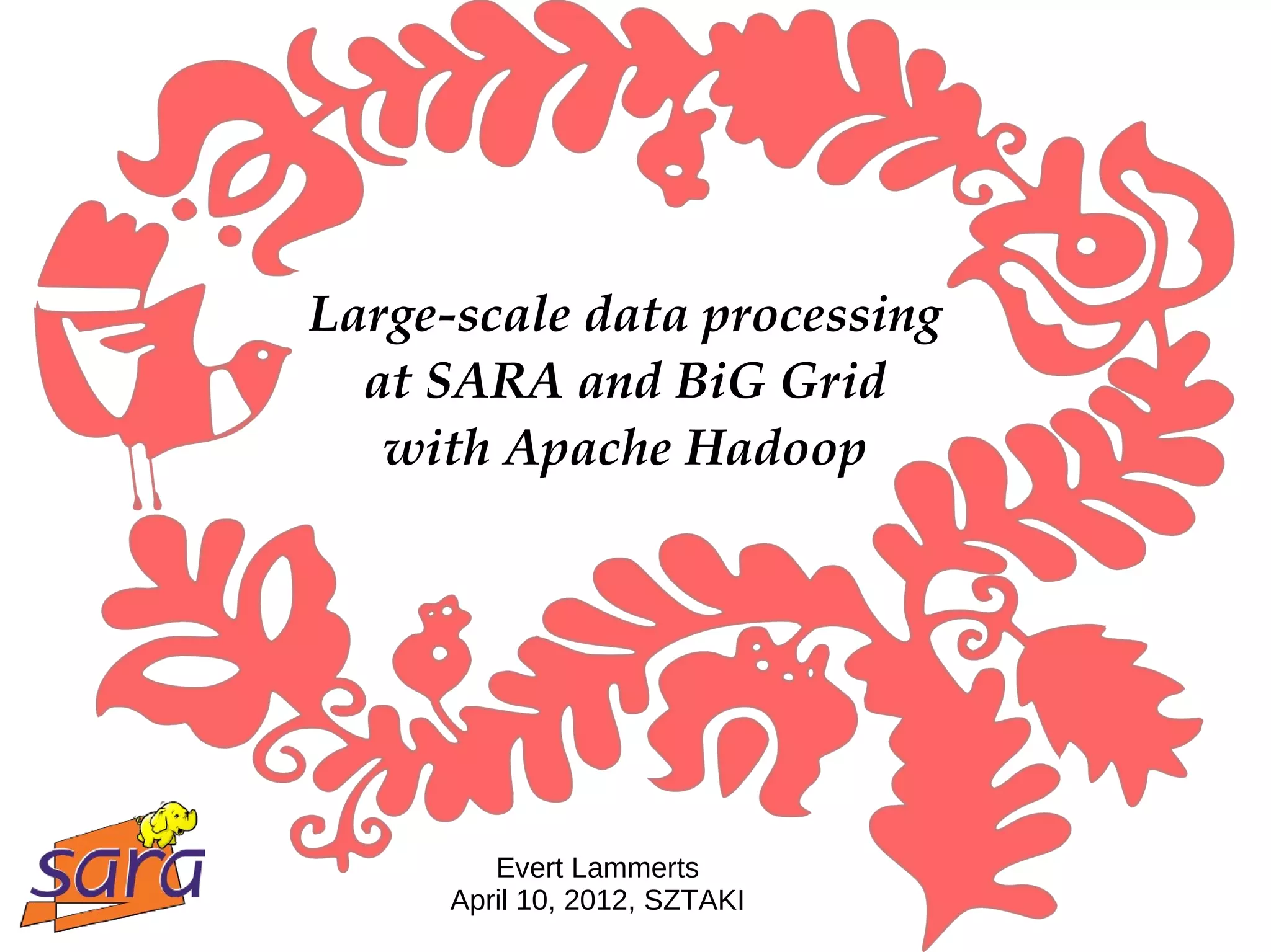 This document discusses large-scale data processing using Apache Hadoop at SARA and BiG Grid. It provides an introduction to Hadoop and MapReduce, noting that data is easier to collect, store, and analyze in large quantities. Examples are given of projects using Hadoop at SARA, including analyzing Wikipedia data and structural health monitoring. The talk outlines the Hadoop ecosystem and timeline of its adoption at SARA. It discusses how scientists are using Hadoop for tasks like information retrieval, machine learning, and bioinformatics.