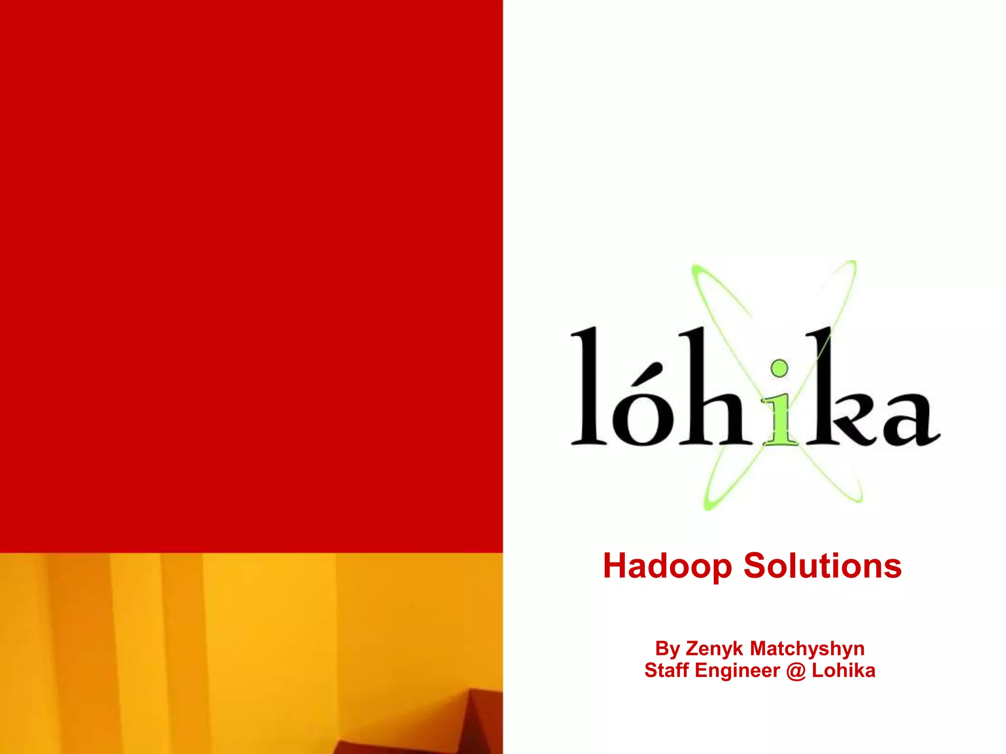 This document discusses Hadoop solutions and tools. It provides an overview of why Hadoop is used for tasks like smart meter analysis and fraud detection. It also describes tools for ingesting and exporting data from Hadoop like Flume and Sqoop. Common data formats, serialization frameworks, compression techniques and tools for testing data are outlined. The document also discusses tools for analysis like Pig and Hive and the HBase database. Finally, it reviews major Hadoop providers like Apache, Cloudera, Amazon EMR and Hortonworks and the future of technologies like Percolator, Dremel and Pregel.