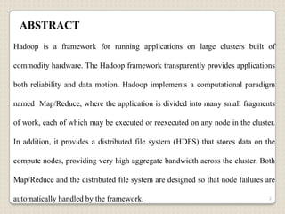 Hadoop is a framework designed for running applications on large clusters of commodity hardware, utilizing a computational model called map/reduce and a distributed file system (HDFS) for reliable data processing. It addresses the challenges posed by the explosive growth of digital data and the slower relative access speeds of storage devices by enabling parallel processing across multiple nodes. The combination of Hadoop and cloud computing facilitates the scalable and cost-effective management of data-intensive applications.