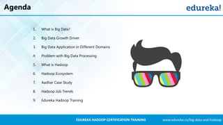 The document outlines Edureka's Hadoop certification training agenda, covering topics related to big data, its growth drivers, and applications across various domains. It discusses Hadoop as a solution for processing and storing large datasets, including its ecosystem and architecture, alongside a case study on the Aadhaar system in India. Additionally, it highlights trends and challenges in handling big data, along with job opportunities in the field.