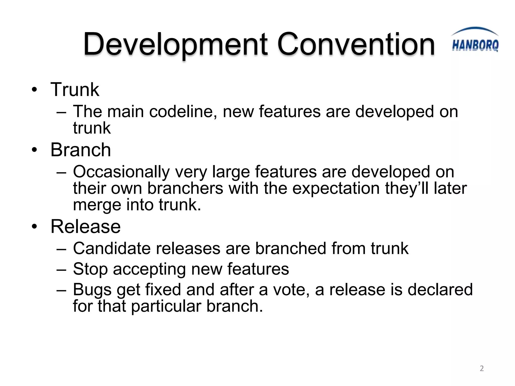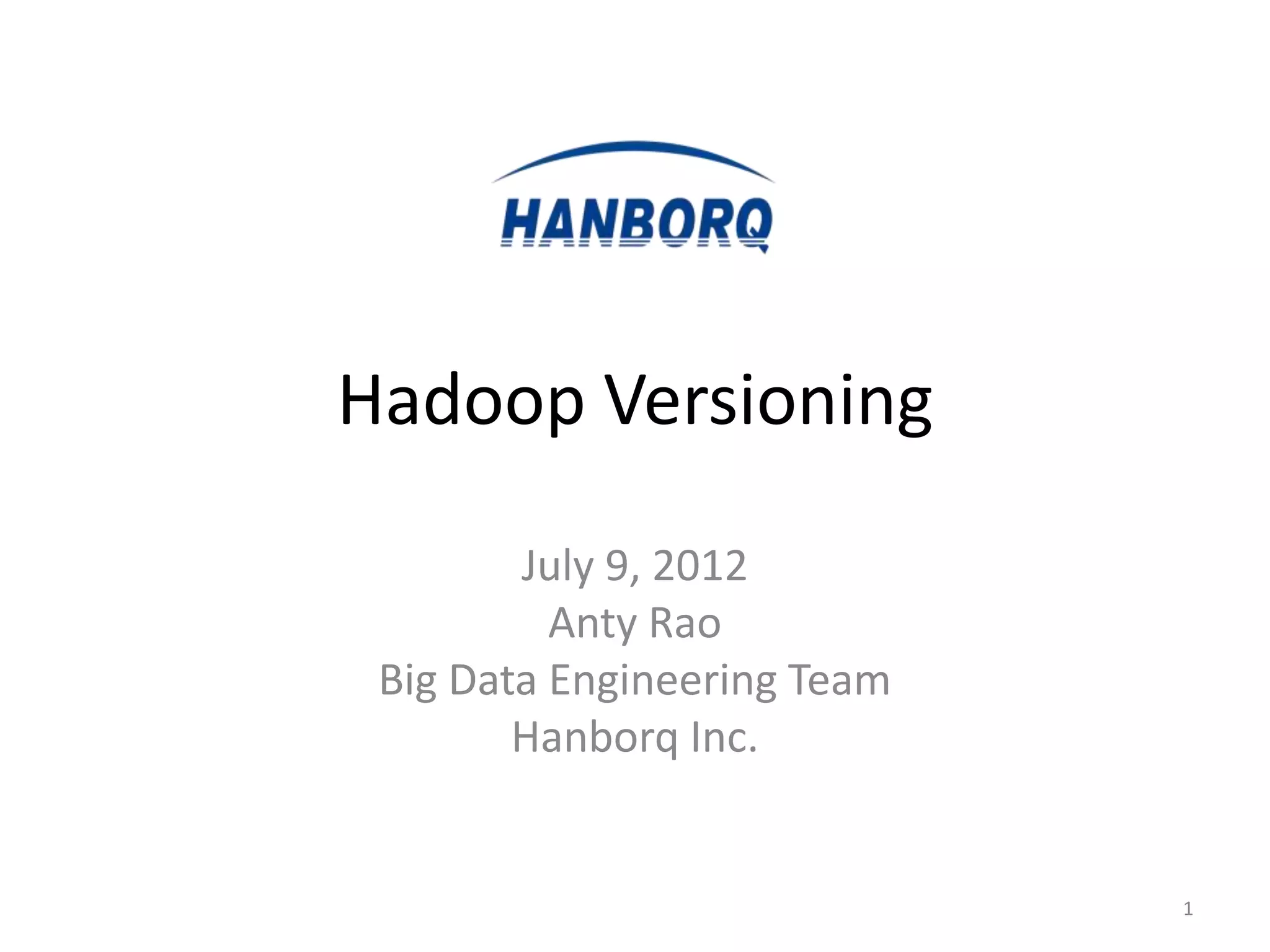 This document discusses the versioning conventions and history of Hadoop releases. It notes that features were occasionally developed on branches off the trunk codeline and that some releases included features from different branches, causing confusion. It also summarizes the status of Hadoop 1.0, which unified many previously separated features, and the versioning of the Cloudera CDH distribution in relation to Apache Hadoop releases.