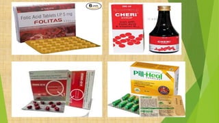 This document provides information about haematinic agents, which are compounds required for blood formation and are used to treat anaemias. It discusses the main haematinic agents - iron, vitamin B12, and folic acid. For each agent, it outlines their daily requirements, dietary sources, functions, deficiency states, example drug names, and uses in treatment. The document is presented by several students and guided by their instructor, Mr. Hari Prasad Sonwani. It provides references at the end.