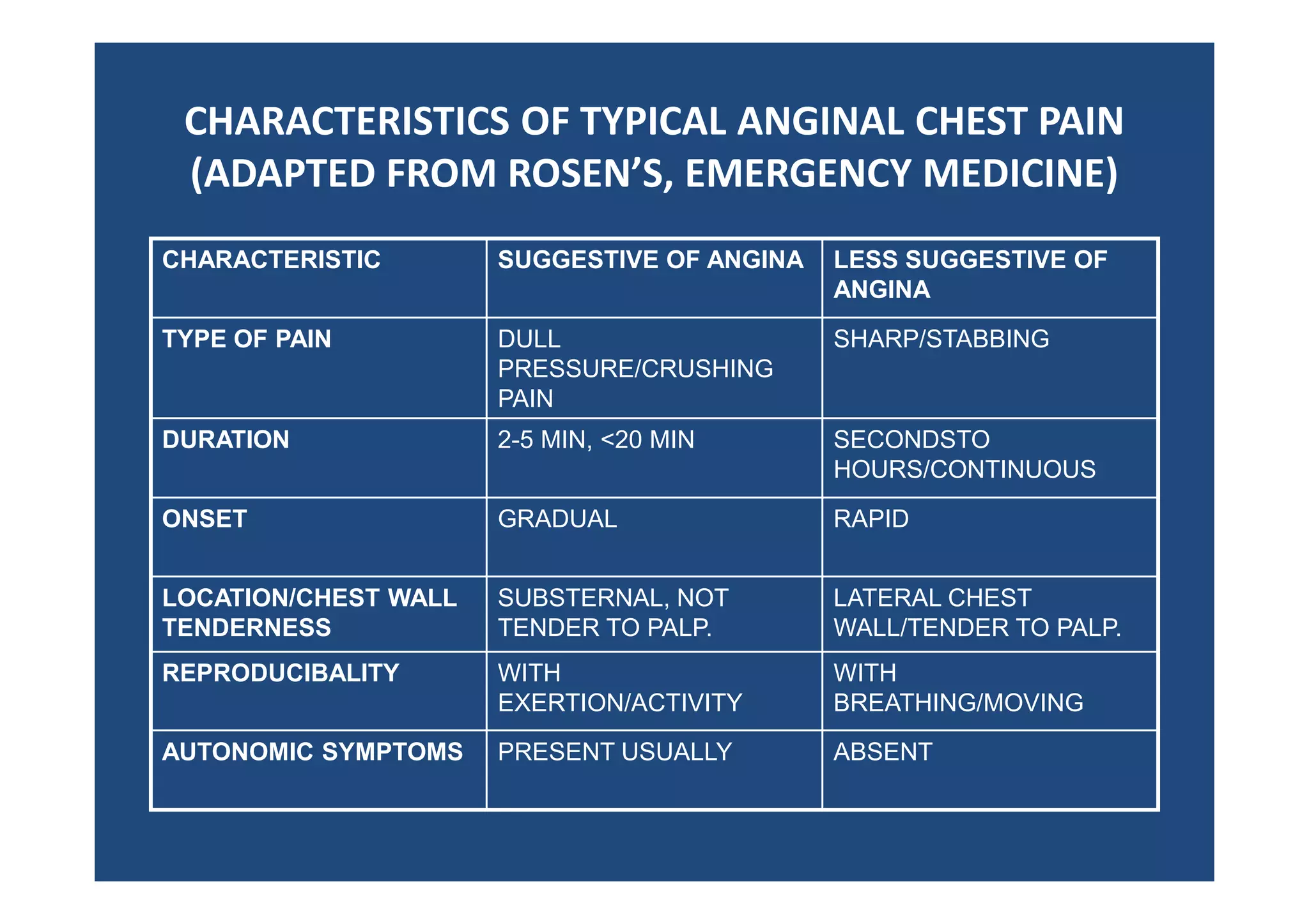 The document discusses the characteristics of anginal chest pain and classifies various levels of angina according to severity. It details the pathophysiology and management of acute coronary syndromes (ACS) including non-ST elevation myocardial infarction (NSTEMI) and ST elevation myocardial infarction (STEMI), covering both acute treatments and secondary prevention strategies. Additionally, it highlights complications of myocardial infarction such as arrhythmias and acute mitral regurgitation, emphasizing the importance of appropriate medical management and revascularization.