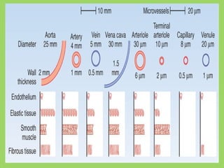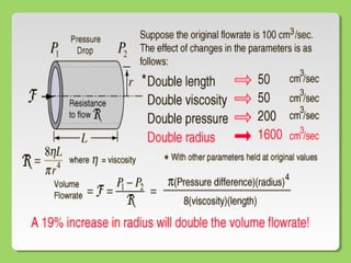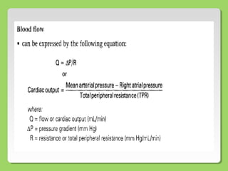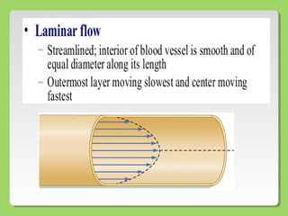 3. It covers hemodynamics, explaining concepts like blood flow, cardiac output, laminar versus turbulent flow, and how blood flow is determined by factors like pressure difference and vascular resistance according to Poiseuille's law.