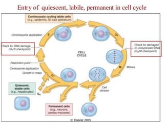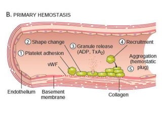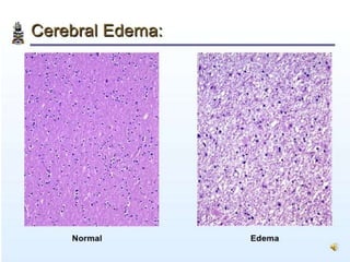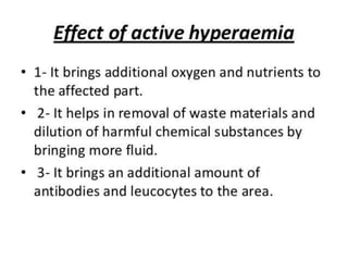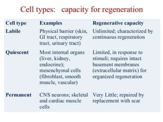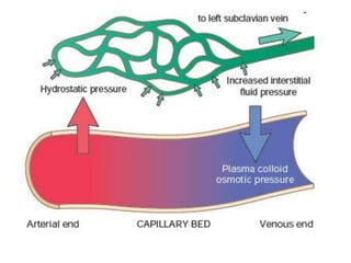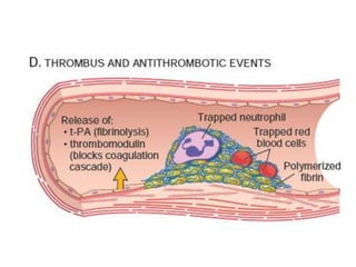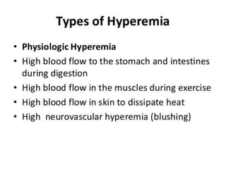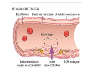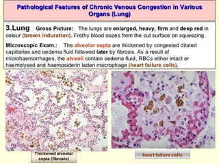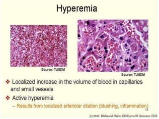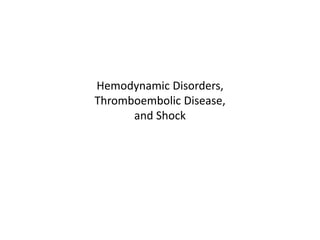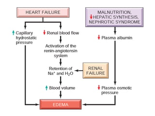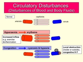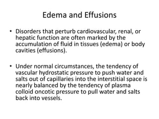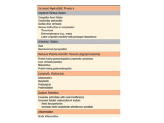 The document discusses the mechanisms of edema and fluid accumulation in tissues caused by various hemodynamic disorders, including issues with hydrostatic pressure and plasma oncotic pressure. It details the differences between inflammatory and non-inflammatory edema, along with causes such as heart failure and renal dysfunction, and explores the mechanisms of hemostasis and thrombosis in the context of vascular injury. Additionally, it covers tissue repair processes, including primary and secondary healing, and factors influencing tissue repair outcomes.