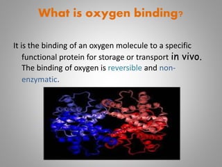 The document discusses the structure and function of hemoglobin, detailing its composition, synthesis, and historical research developments. It highlights key aspects such as oxygen binding, cooperative and allosteric effects, variants of hemoglobin, and associated genetic mutations. Additionally, it addresses hemoglobin deficiencies, diseases related to hemoglobin such as sickle cell disease, and mentions possible treatments.