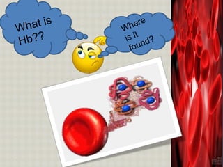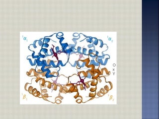 Hemoglobin is an iron-containing protein in red blood cells that transports oxygen from the lungs to tissues and carbon dioxide from tissues back to the lungs. It is a globular tetrameric protein composed of two alpha and two beta chains, with each chain containing a heme group that binds to oxygen. Hemoglobin undergoes a conformational change upon oxygen binding that makes the remaining binding sites have a higher affinity for oxygen in a cooperative binding process essential for oxygen transport.
