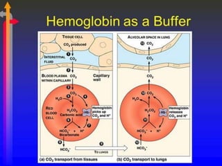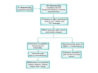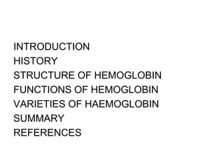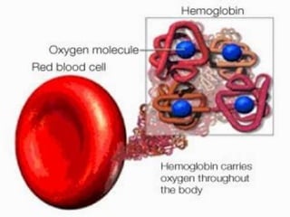 This document provides information on hemoglobin structure and function. It discusses the history of hemoglobin discovery and describes the globin and heme components. Hemoglobin transports oxygen from the lungs to tissues and carbon dioxide from tissues to the lungs. Varieties include adult, fetal, and other variants like hemoglobin S, C, and E. Derivatives such as oxyhemoglobin, carbaminohemoglobin, and methemoglobin are also reviewed. Hemoglobinopathies include structural variants and thalassemias. Sickle cell anemia results from substitution of one amino acid, causing red blood cells to sickle in low oxygen conditions. Thalassemias are globin chain synthesis defects.