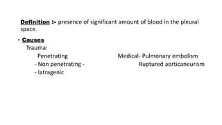This document discusses haemothorax, which is the presence of blood in the pleural space. It can be caused by trauma, medical issues like pulmonary embolism, or iatrogenically. Clinical presentation includes chest pain, dyspnea, and reduced breath sounds on the affected side. Diagnosis involves chest x-ray, CT scan, or ultrasound. Treatment depends on the cause but typically involves insertion of a chest tube for drainage. Complications can include clot retention, infection, or effusion. Physiotherapy may include deep breathing exercises, mobilization, and assisted coughing to improve ventilation and clear secretions.