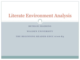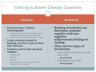 This document discusses strategies for getting to know literacy learners and selecting appropriate texts. It emphasizes the importance of learning about students' backgrounds, interests, and literacy experiences. Teachers should use reading inventories and activities like "Me Stews" to understand their students as individuals. When selecting texts, factors like readability, length, structure, print size, and visual support should be considered to match texts to students' abilities. The document also outlines perspectives like interactive, critical, and responsive that teachers can adopt to strengthen students' reading, writing, analysis, and connection-making skills through strategies such as decoding practice, author studies, and response journals.