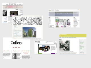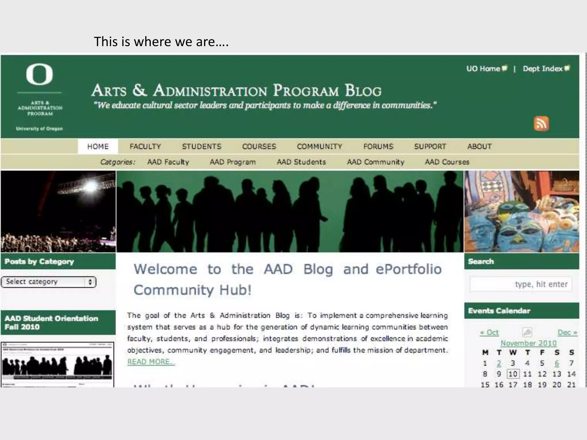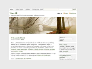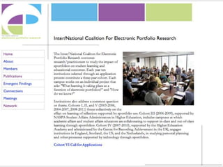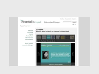 The document discusses the use of eportfolios at the University of Oregon's Arts and Administration Program. It states that eportfolios allow students to showcase their learning journey over time through reflective writing, projects, research, and media. Students use eportfolios to document their work in courses and internships, map their progress towards learning objectives, and develop their professional online presence. The program aims to prepare students for 21st century careers by teaching eportfolio development and the application of social media and technology for lifelong learning.