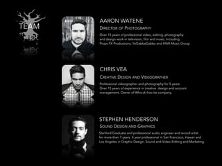 HAPAproductions provides professional video, photography, audio, and design services with a team that has over 15 years of experience in those fields. They have a variety of cameras, lenses, lighting, audio equipment, and stabilizers. Their services include videography, photography, audio/video editing, sound design, and they can handle projects for film, television, events, and more.