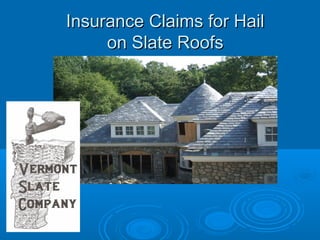 This document discusses insurance claims for hail damage on slate roofs. It notes that hail damage may not always be visible in the form of bullet holes and can appear as edge breaks or cracks. Close inspection is needed to identify fresh fractures underneath aging and dirt. While new slate may show fractures rather than holes, older slate can have thousands of fractured slates leading to total loss. Fractures allow water to penetrate and cause further breakage when freezing. The document provides guidance on assessing damage levels and determining whether repair or full replacement is needed.