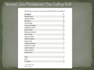 This document provides a brief overview of some lesser known US presidents, ranking John Quincy Adams as #6 and discussing his role in the heated 1824 presidential election. It also mentions Martin Van Buren at #8, John Tyler at #10 and some details about his wives, Millard Fillmore at #13 and his connection to Queen Victoria, Franklin Pierce at #14 including his military service and family tragedy, James Buchanan at #15, Rutherford B. Hayes at #19, Benjamin Harrison at #23, and Grover Cleveland as both the 22nd and 24th president.