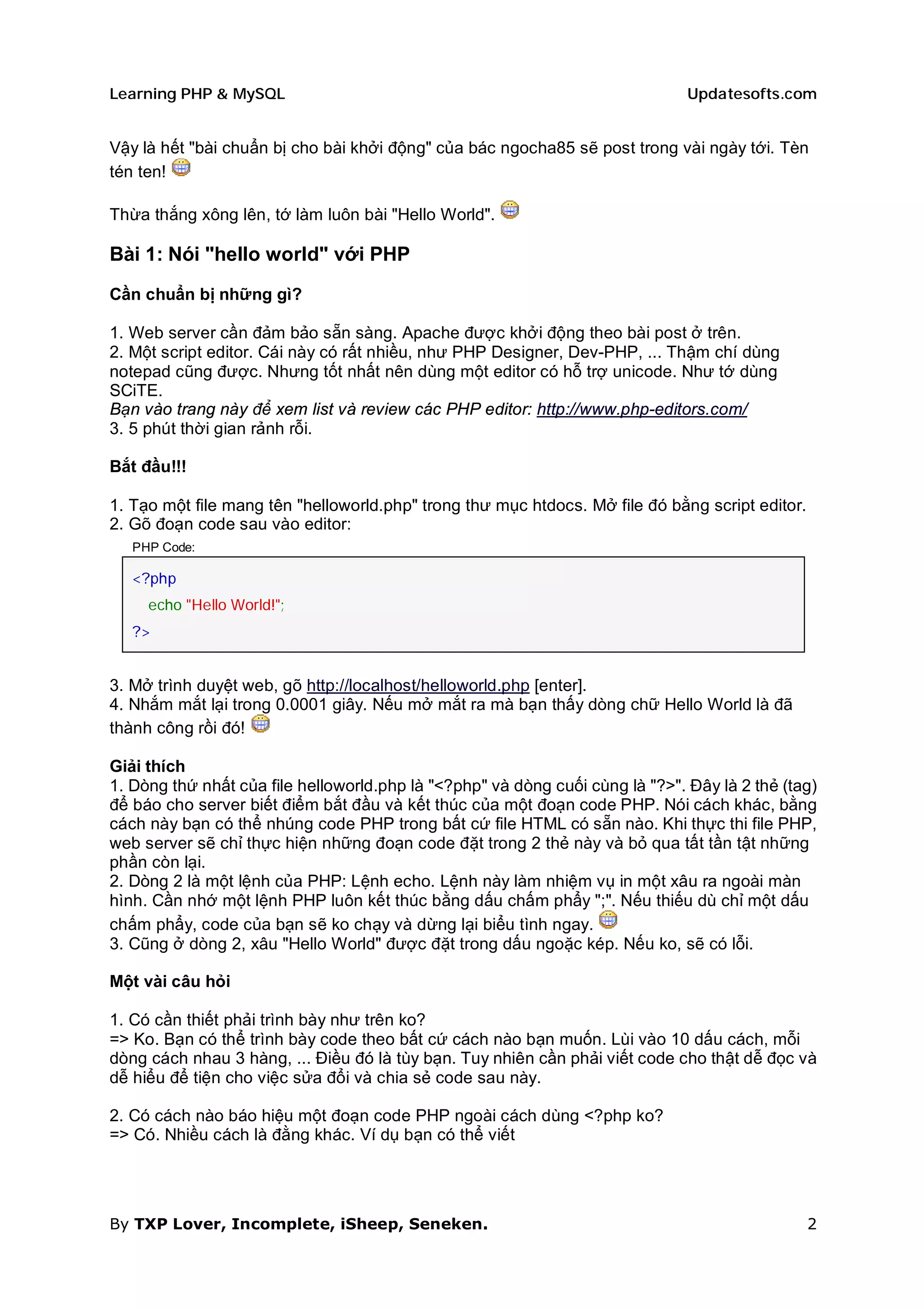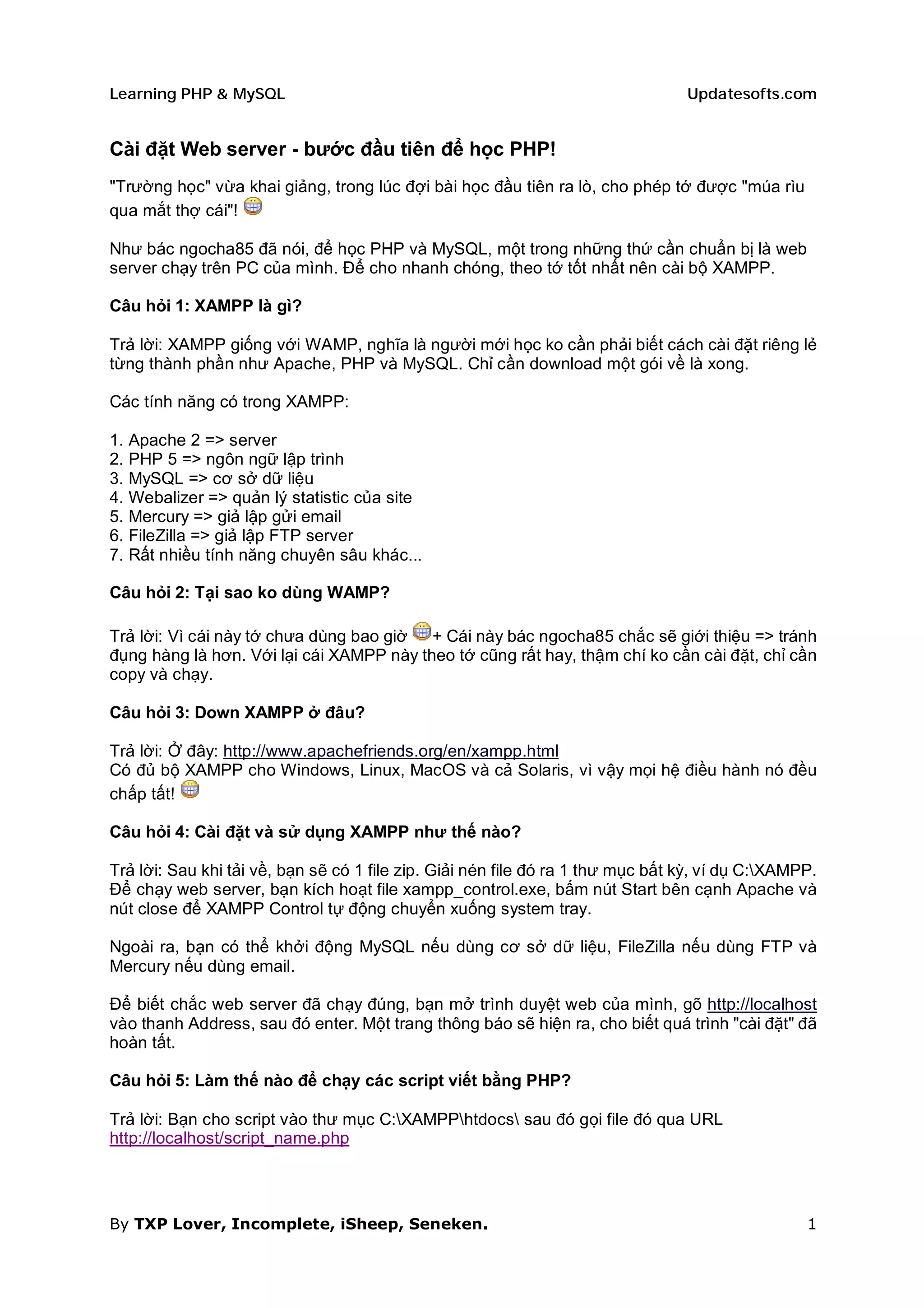 Tài liệu hướng dẫn cài đặt web server và sử dụng PHP & MySQL, khuyến nghị sử dụng XAMPP để đơn giản hóa quá trình cài đặt. Nó bao gồm cách tạo một script PHP cơ bản để hiển thị 'hello world', cũng như các khái niệm về biến và kiểu dữ liệu trong PHP. Ngoài ra, tài liệu cũng đề cập đến việc viết chú thích trong code và các quy tắc đặt tên biến.