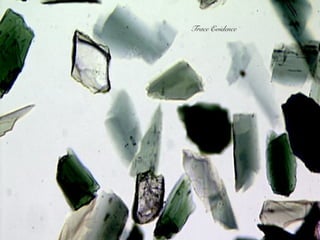 This document discusses trace evidence, specifically hair. It provides reasons why hair is useful for analysis, such as its ability to resist decomposition and retain structure. However, hair cannot be individualized and has variable morphology within individuals. The document then describes hair structure including the cuticle, medulla, root cycle, and class characteristics like color, length, diameter and treatment.