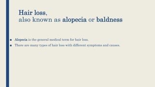 The document discusses various causes and types of hair loss, also known as alopecia, including genetic factors, autoimmune conditions, and effects of chemotherapy. It covers diagnostic methods, prevention strategies, and treatment options for different types of hair loss, such as androgenetic alopecia and alopecia areata. Nutritional recommendations and the psychological impact of hair loss are also highlighted.