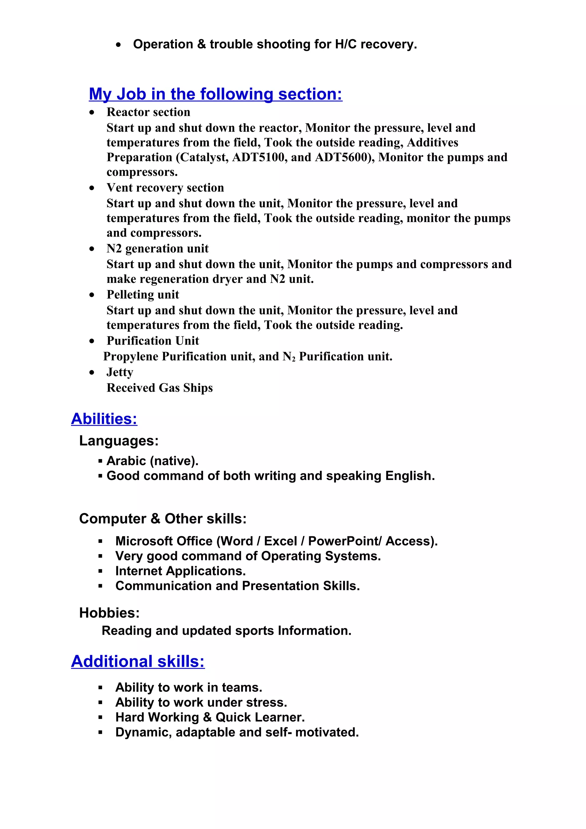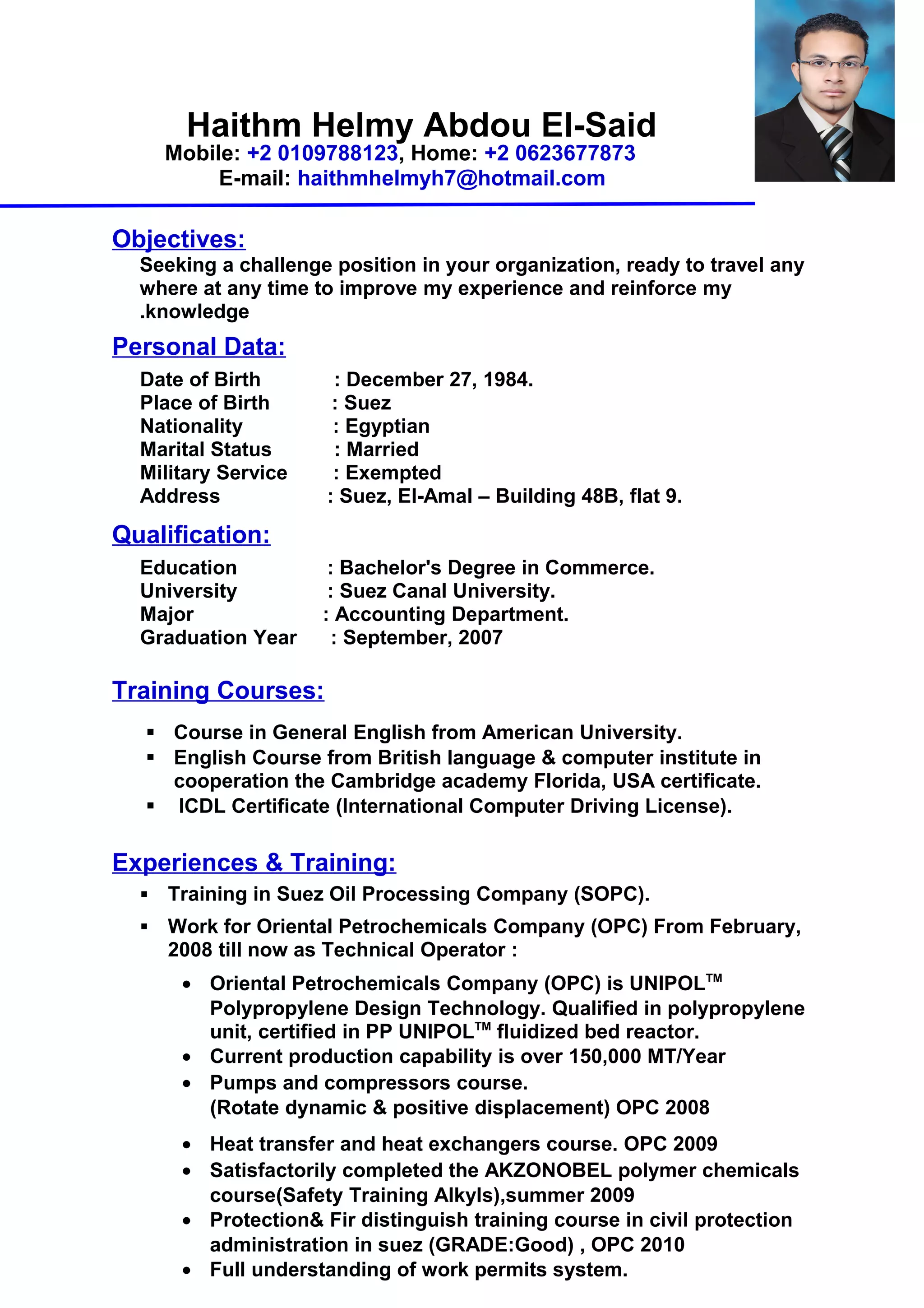 This document contains a resume for Haithm Helmy Abdou El-Said. It includes his contact information, education history, qualifications, work experience, skills, and hobbies. He has a Bachelor's Degree in Commerce from Suez Canal University and over 10 years of experience working at Oriental Petrochemicals Company as a Technical Operator in their polypropylene production facility. His roles included operating and monitoring various units like reactors, vent recovery, nitrogen generation, and purification. He also has skills in Microsoft Office, computer operating systems, and communication.