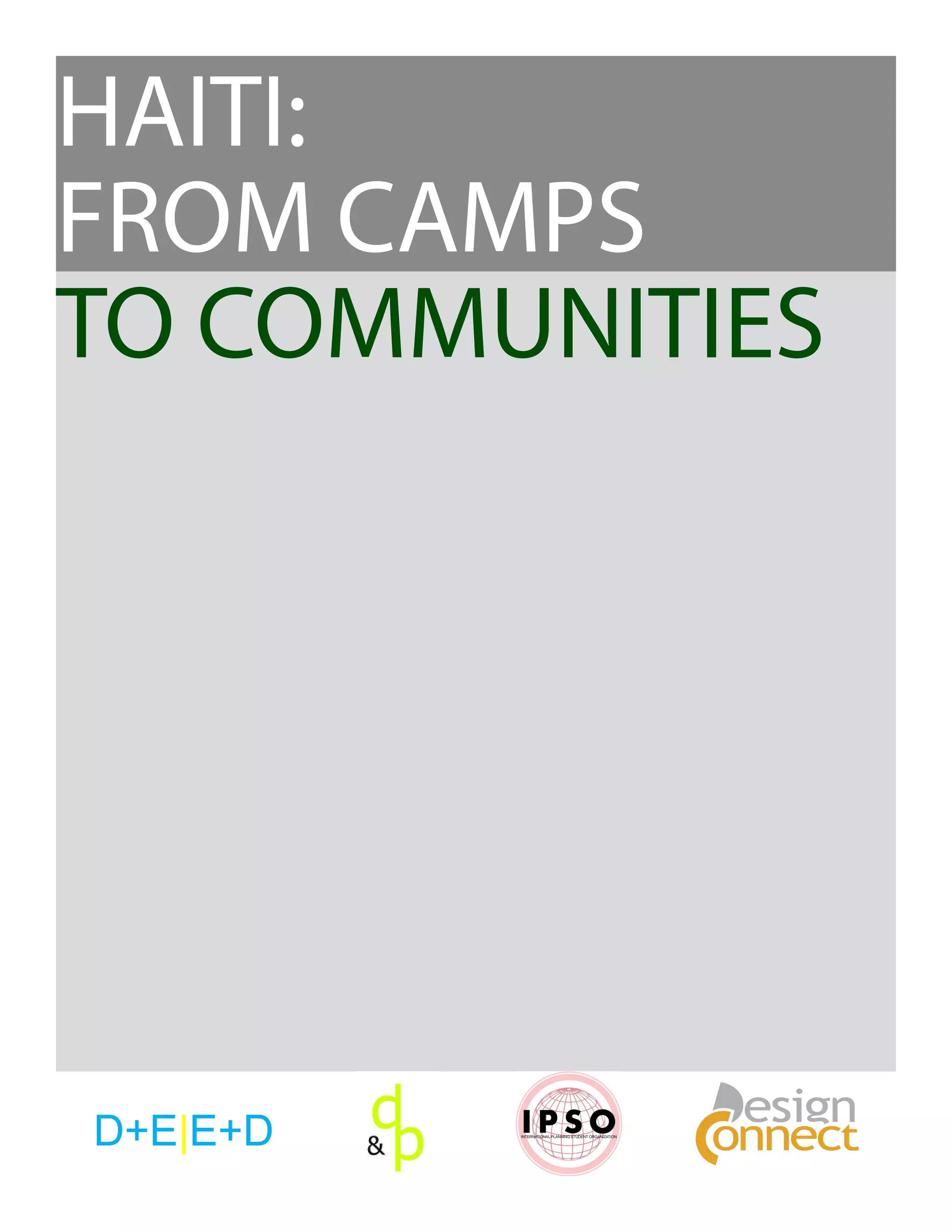 The document proposes strategies for transitioning Haitian refugees from camps to permanent communities. It recommends selecting a large site near roads and services that has suitable physical characteristics. An infrastructure layout is suggested using a grid for efficiency with shared utilities. Construction strategies focus on using local materials and a phased approach, starting with temporary shelters that can later be incorporated into permanent homes. The goal is to house refugees safely and quickly while establishing self-sustaining communities.