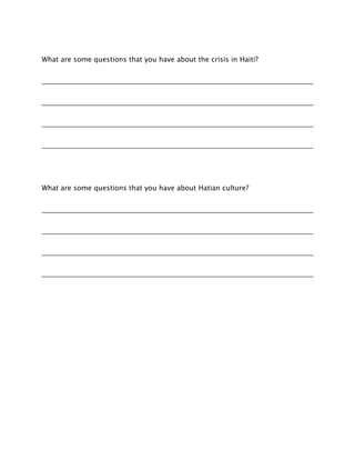 Haiti is a country located in North America that was recently impacted by a crisis. The capital of Haiti is Port-au-Prince and the primary languages spoken are French and Haitian Creole. The document appears to be a pre-assessment for students to gauge their existing knowledge of Haiti before learning more about the country and its culture.