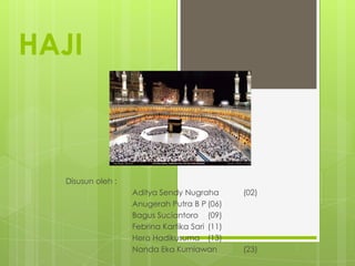 Haji adalah ibadah yang diwajibkan bagi umat Islam yang mampu, dilakukan dengan mengunjungi Baitullah pada waktu tertentu untuk mendapatkan keridhaan Allah. Terdapat tiga jenis pelaksanaan haji yaitu haji ifrad, tamattu', dan qiran, yang masing-masing memiliki makna dan tata cara yang berbeda. Haji juga memiliki syarat, rukun, dan larangan yang harus dipatuhi agar ibadah tersebut sah.