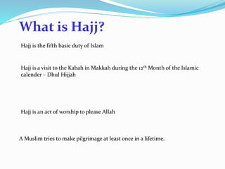 The document provides information about the Hajj pilgrimage in Islam. It explains that Hajj is the fifth pillar of Islam that involves visiting the Kaaba in Mecca during the last month of the Islamic calendar. The Kaaba was originally built by the prophets Adam and Abraham and their son Ishmael, and it is the focal point for Muslim prayer. The document outlines the specific rituals performed during Hajj over several days, including putting on the ihram clothing, spending a day in Arafat and night in Muzdalifah for prayer, throwing stones at pillars in Mina, sacrificing an animal, and shaving or trimming hair before performing a circling walk and running between the hills