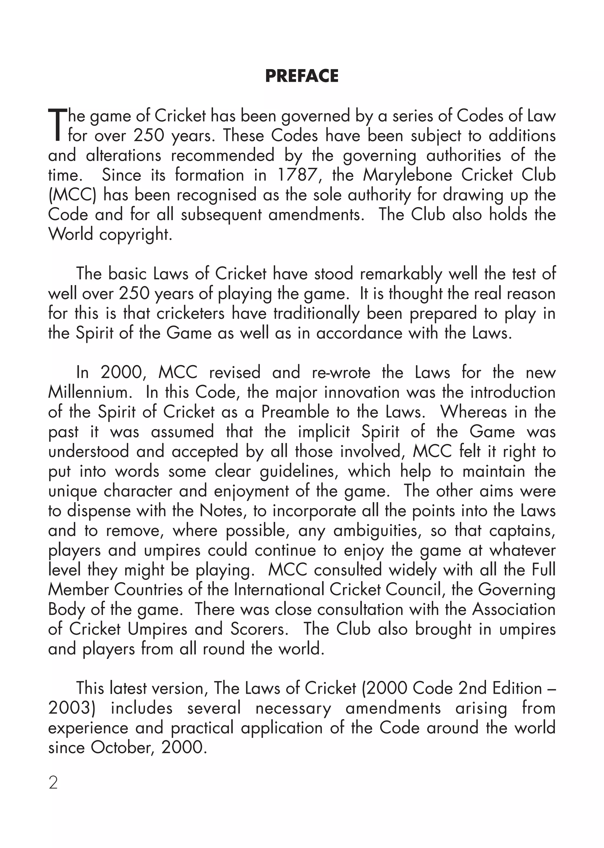 - In 2000, the MCC revised the laws and introduced the "Spirit of Cricket" as a preamble, to provide clear guidelines upholding the enjoyment and character of the game.