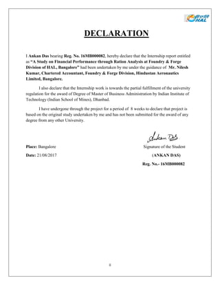 The document is a summer training report that presents a study on the financial performance through working capital management at Hindustan Aeronautics Limited (HAL) in Bangalore, submitted by Ankan Das as part of his MBA program. It covers various aspects of working capital management including definitions, importance, and methodologies used for the analysis, as well as insights into HAL's organizational structure, functions, and operational strategies. The report emphasizes the critical role of effective working capital management in ensuring smooth business operations and stability in financial health.