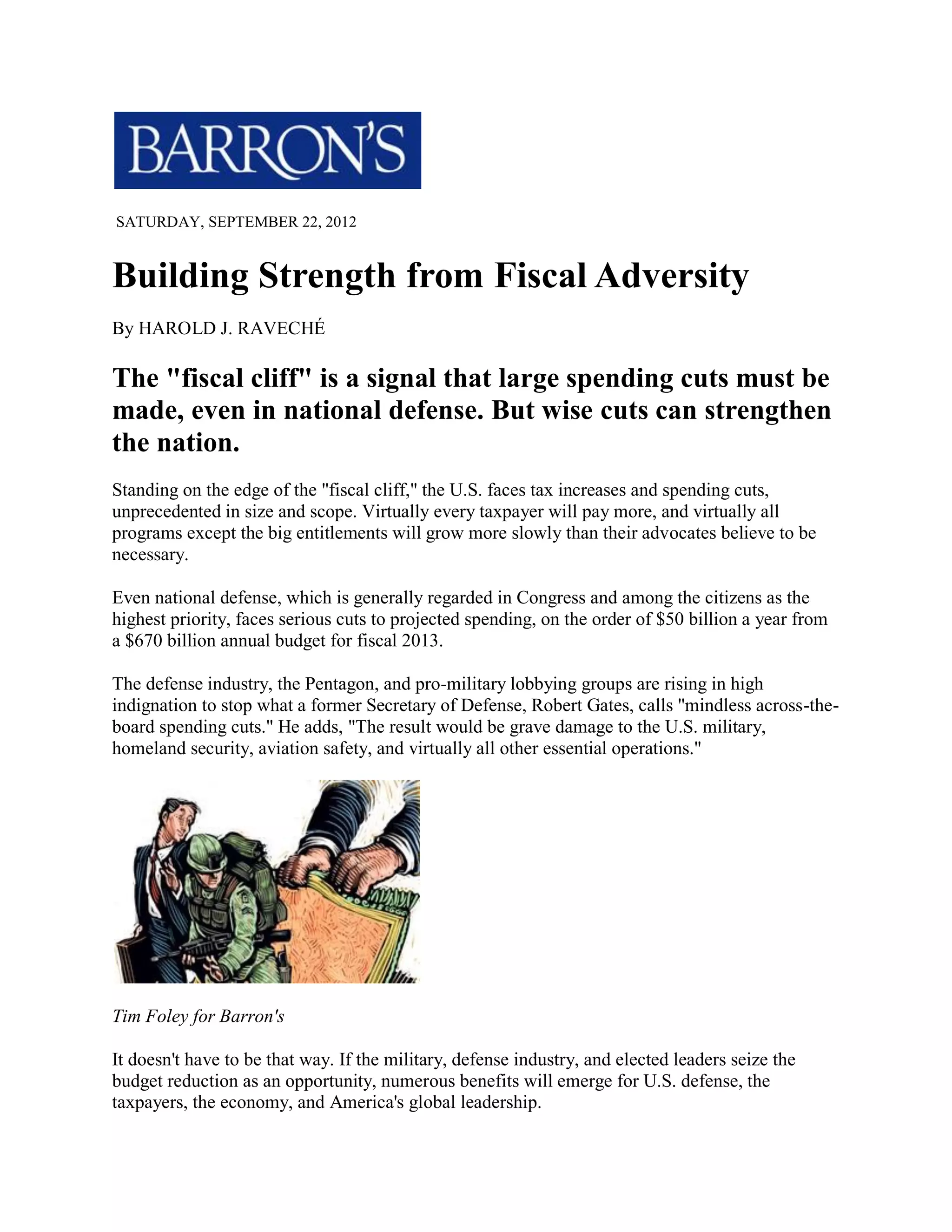 The document discusses the implications of significant spending cuts on the U.S. military, emphasizing that these cuts could be used as an opportunity to strengthen defense through strategic resource allocation and innovation in technology. It advocates for safeguarding defense research and development, encouraging private-sector investment, and reforming the Pentagon's procurement processes to enhance efficiency. The author warns against careless reductions without a comprehensive strategy, as this could harm military effectiveness and undermine America's global leadership.